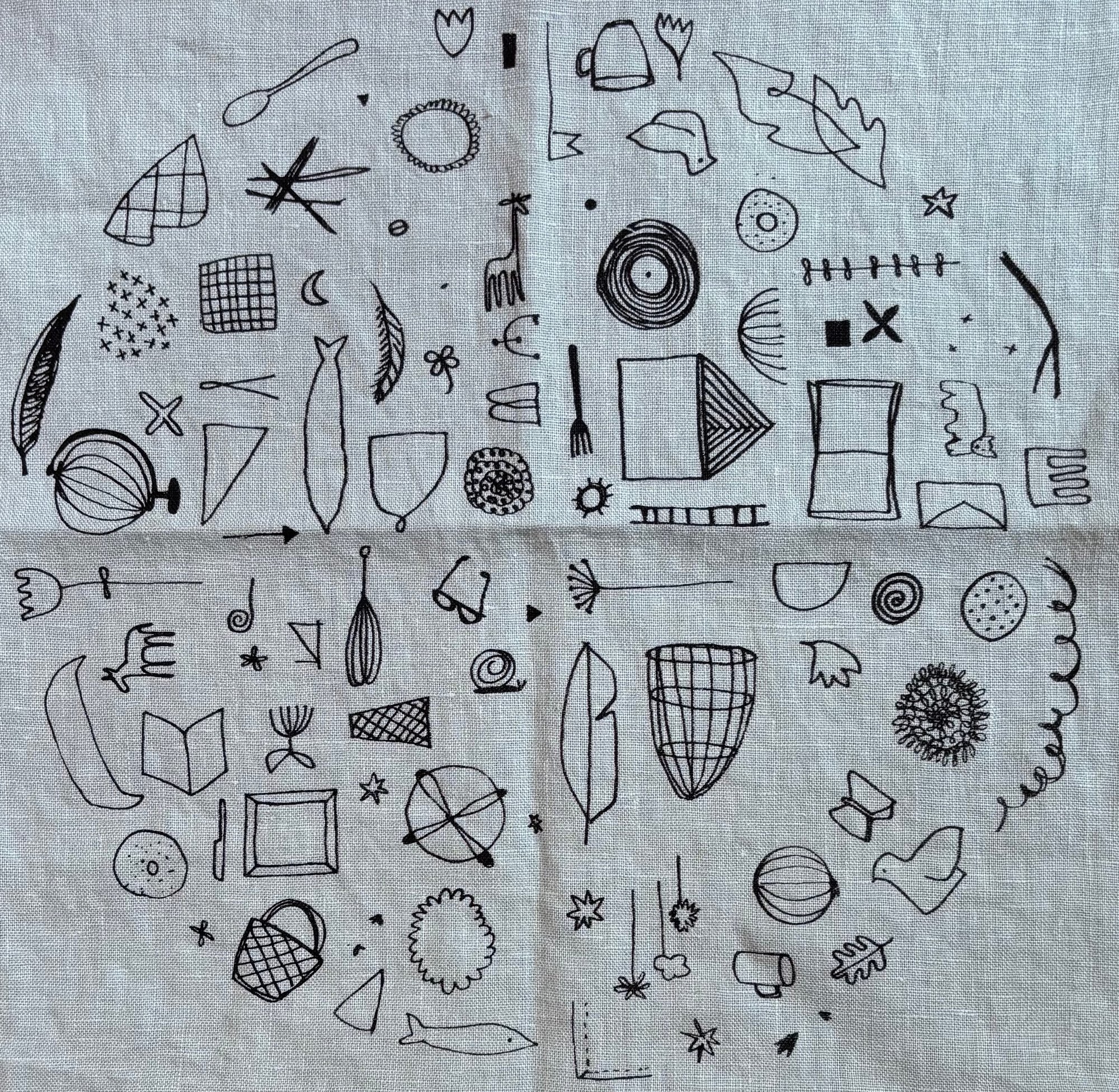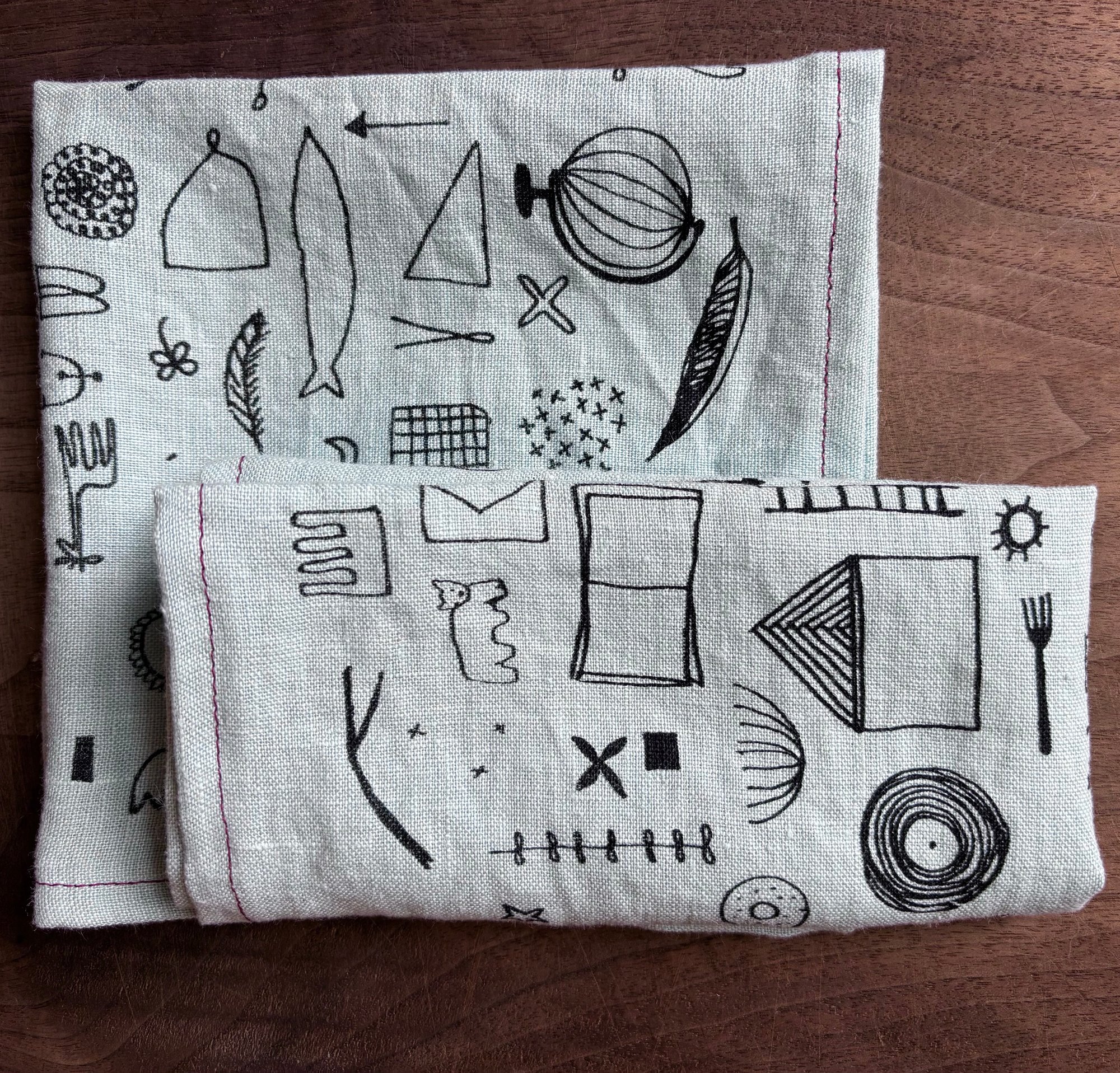 Set of 2 napkins, approx. 13 1/2" square. Screenprinted by hand in black ink on pale blue linen, hemmed with red cotton thread to emphasize my very human use of a sewing machine as I improve my mitered corners!
