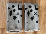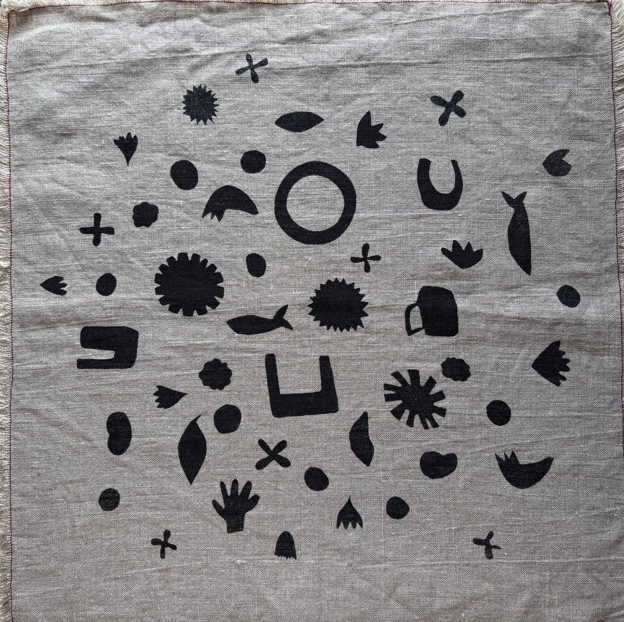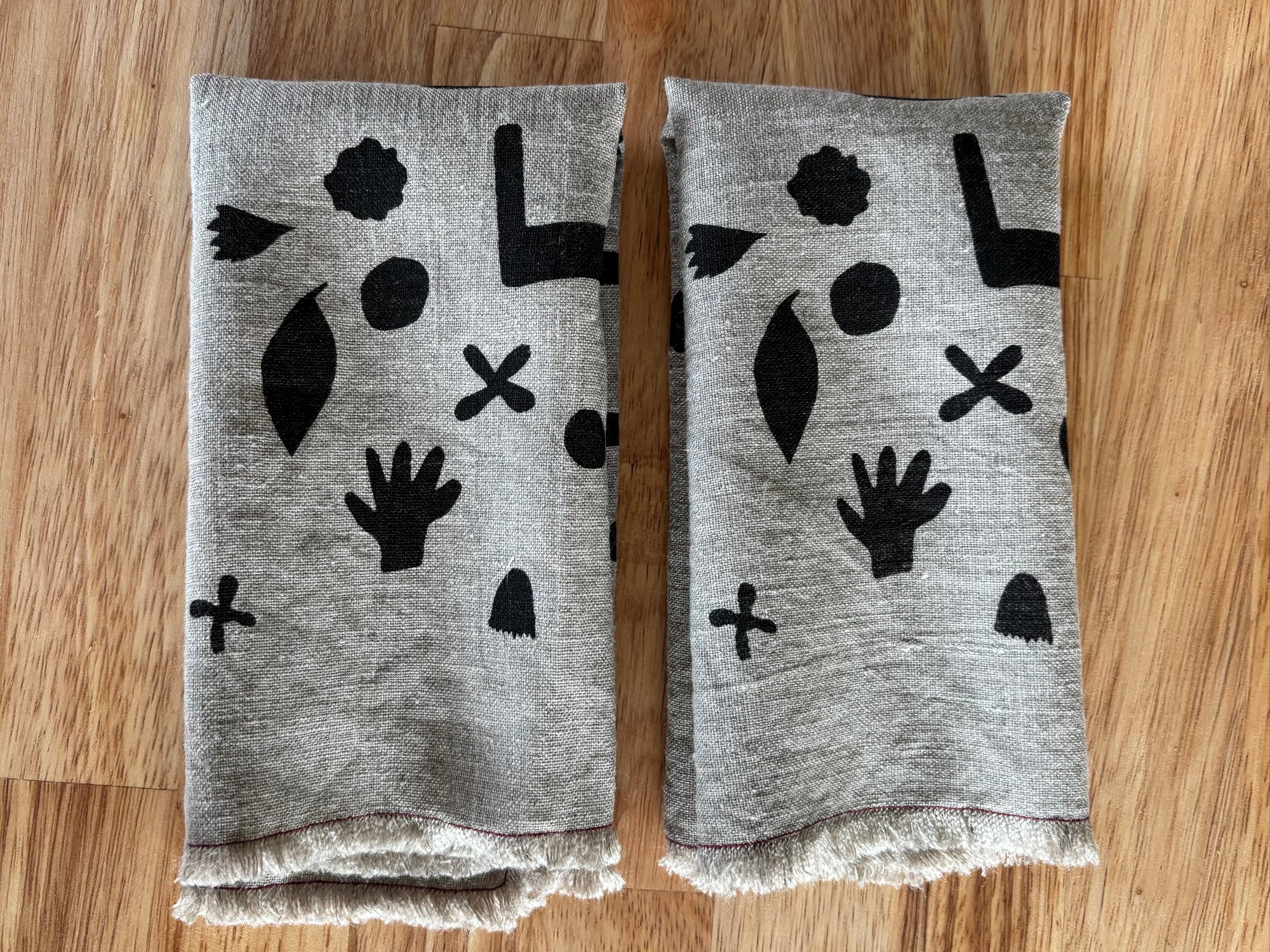 Set of 2 napkins, approx. 15" square. Screenprinted by hand in black ink on natural linen, machine stitched around the edge with red cotton thread and fringed.