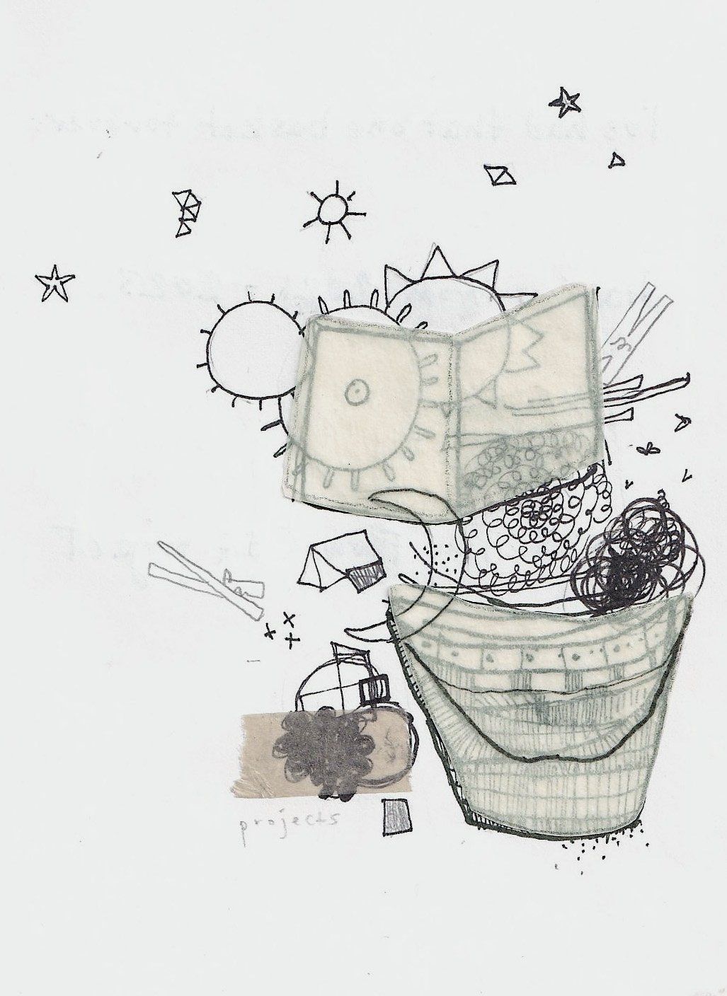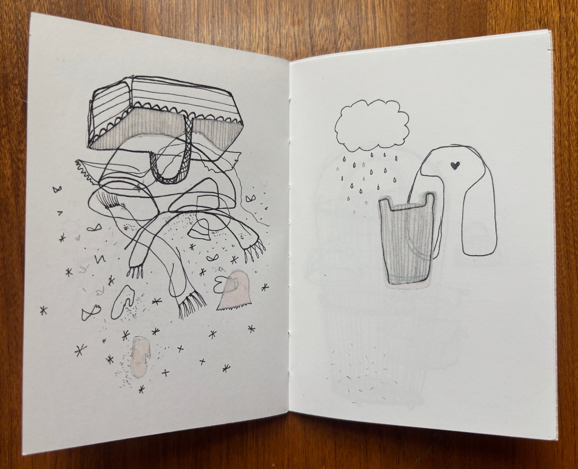 Zine, 5" x 4", 16 pages. Laser printed from original drawings, handmade paper cover, cutch-dyed cut paper detail, chain stitched.